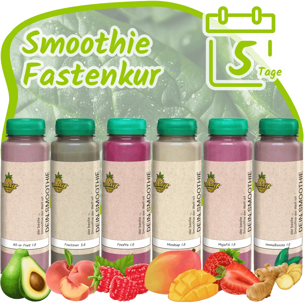 Du möchtest mit einer 5-tägigen Smoothie Fastenkur deinen Darm entgiften, die Gut Health optimieren oder einfach bewusster leben? Unsere wissenschaftlich entwickelte Kur kombiniert Scheinfasten Diät-Prinzipien mit 100% Smoothies. Ob Darmsanierung, Darm entschlacken oder Neustart des Mikrobioms – wähle zwischen vier Ausführungen (676-1029 kcal/Tag) und erreiche deine Ziele ohne Nährstoffmangel. Perfekt als Alternative zu herkömmlichen Saftkuren 5 Tage – mit 50% weniger Zucker und dreifach mehr Ballaststoffen für langanhaltende Sättigung.